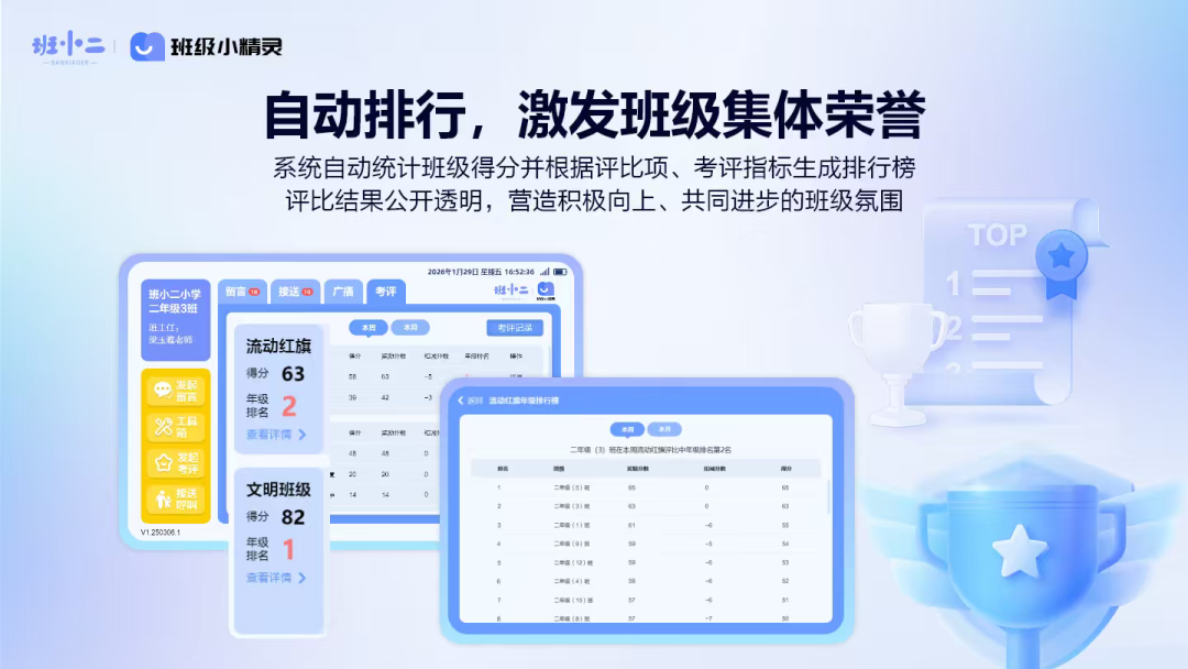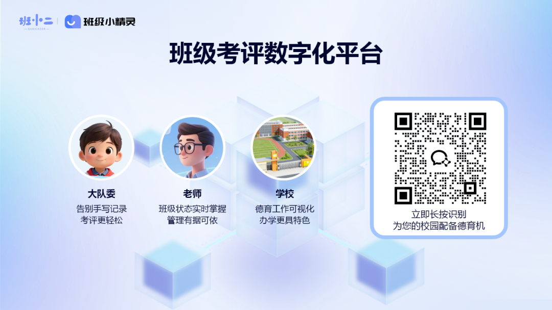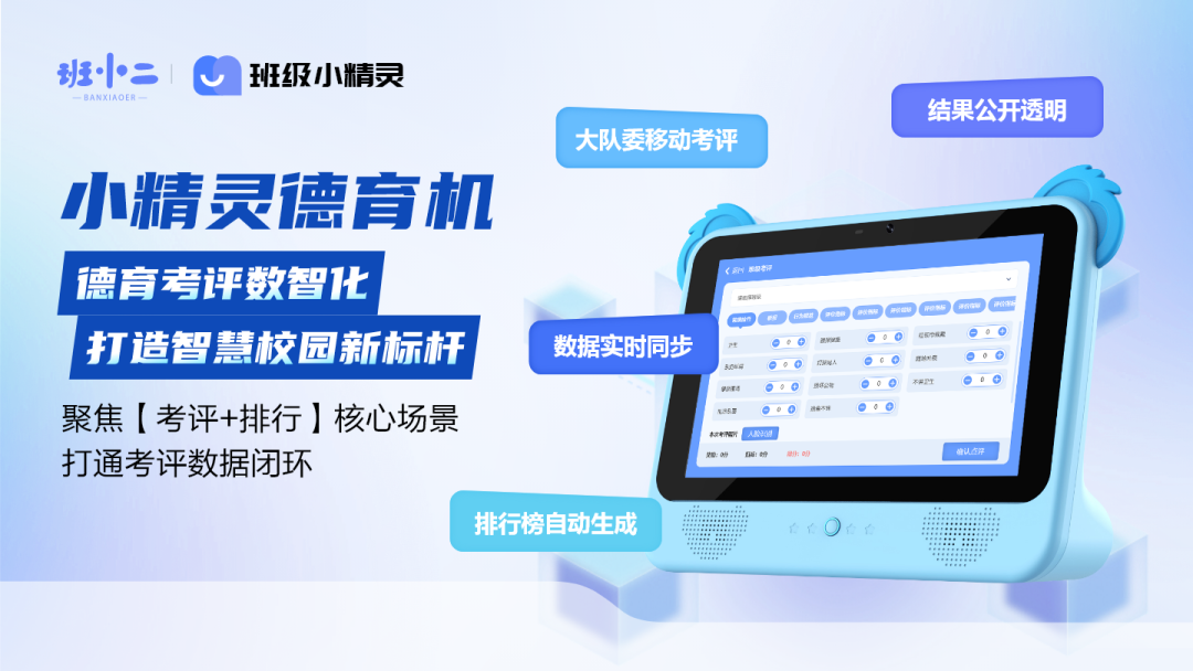 班小二小精灵德育机:一套真正实现 “考评→留痕→排行→公示”全流程数智化的德育管理工具,让德育工作从“凭经验”走向“凭数据”,从“做了”到“做得好、说得清”。