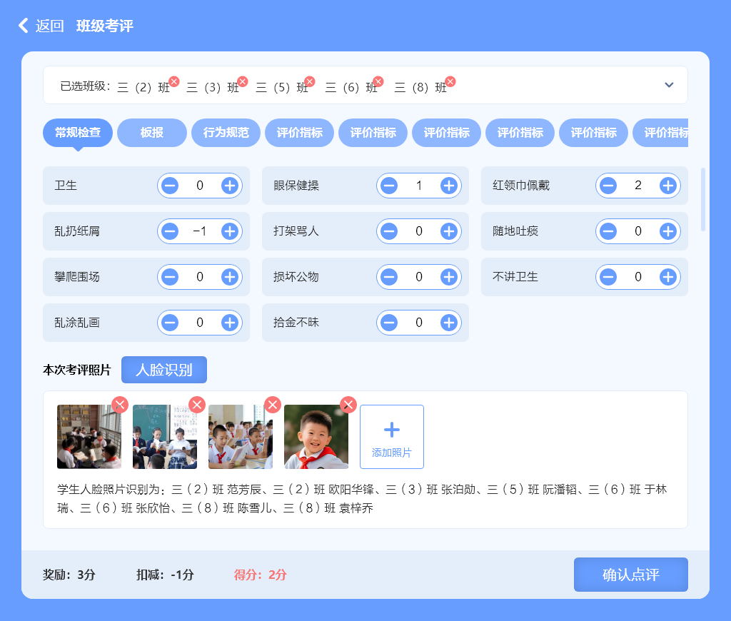 历史追溯:支持按时间、班级、考评人等多维度检索历史记录;