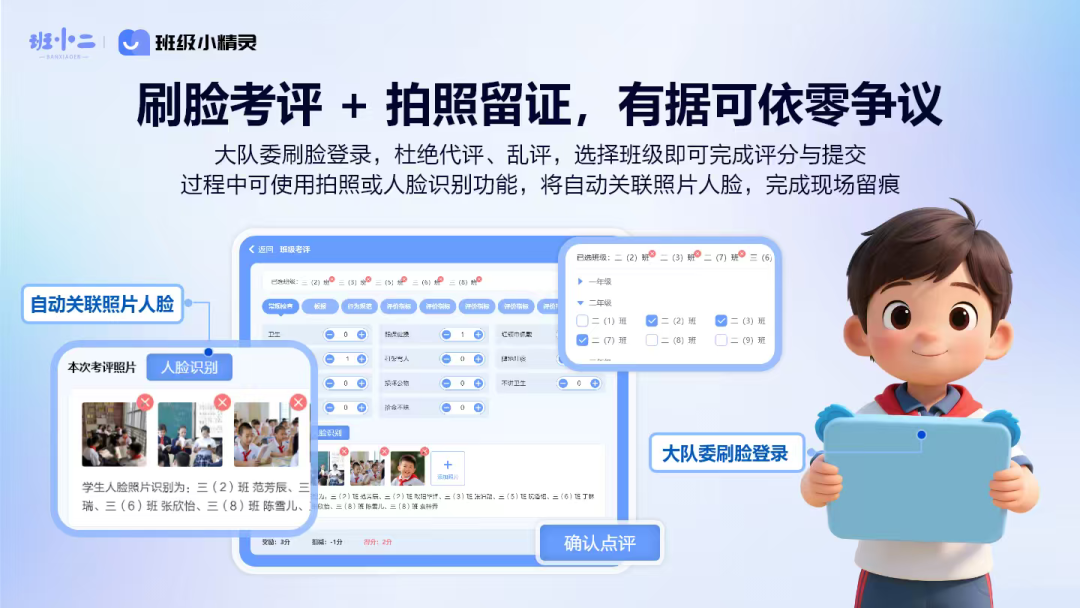 身份核验:大队委刷脸登录,杜绝代评、乱评现象;