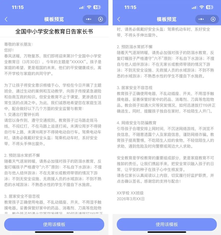 1️⃣每年3月最后一周的星期一是全国中小学安全教育日,今年的安全教育日(3月30日)即将到来。家校配合是安全教育的关键,班小二同步上线《全国中小学安全教育日告家长书》通知模板!