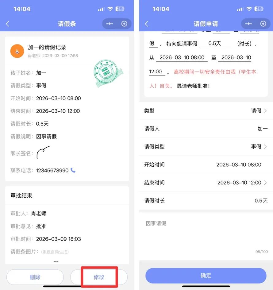 3️⃣支持老师修改审批通过后的请假条中的备注、结束时间(只能缩短或不变)、请假时长