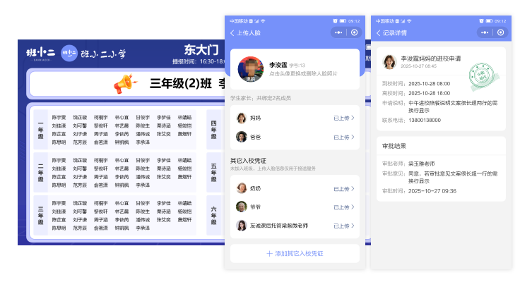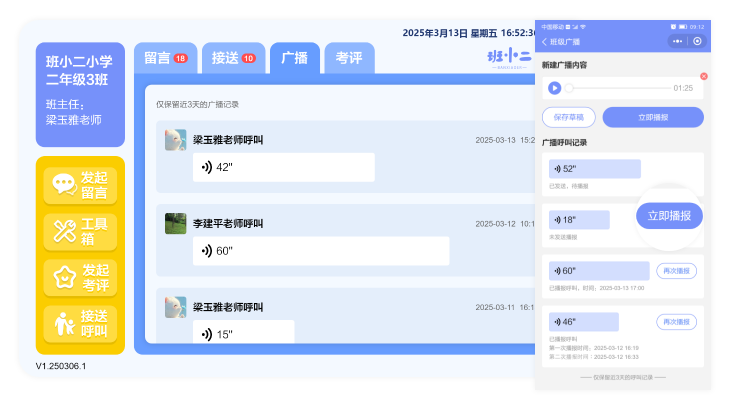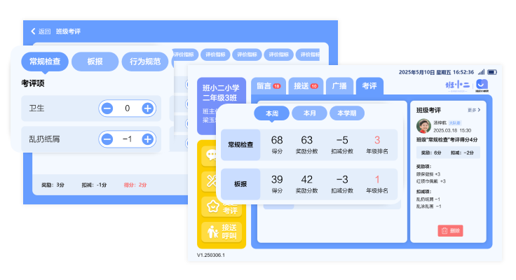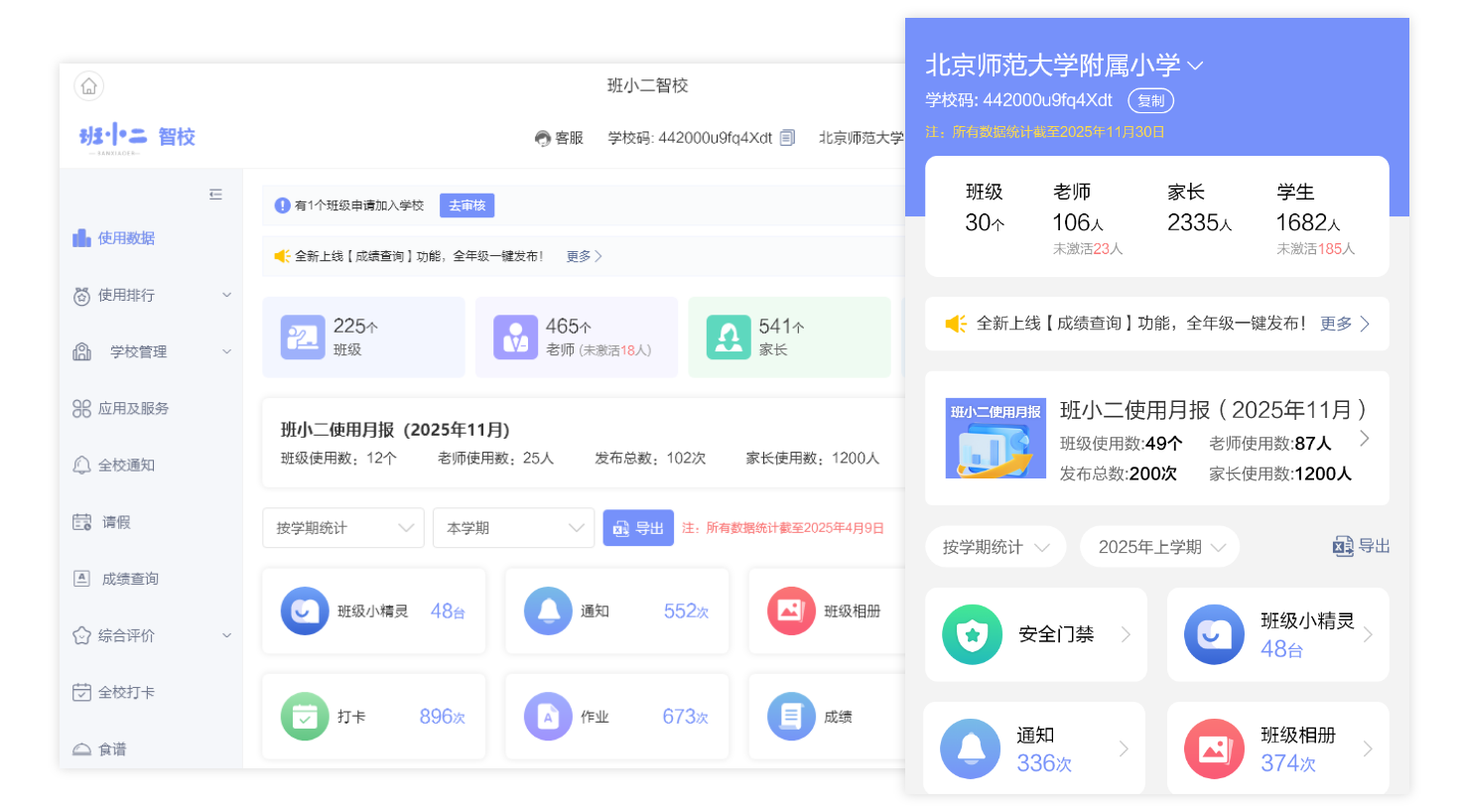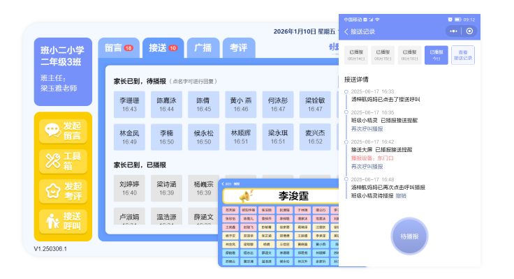 设备与班小二平台实现数据连通,为班级家长孩子提供双向留言、接送呼叫、班级广播、班级考评、德育小助手等辅助功能,