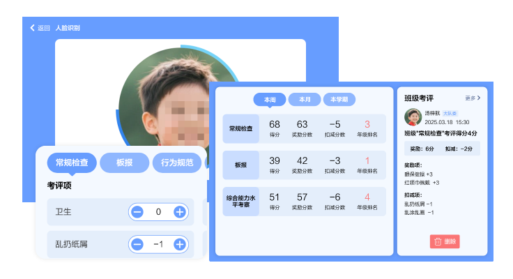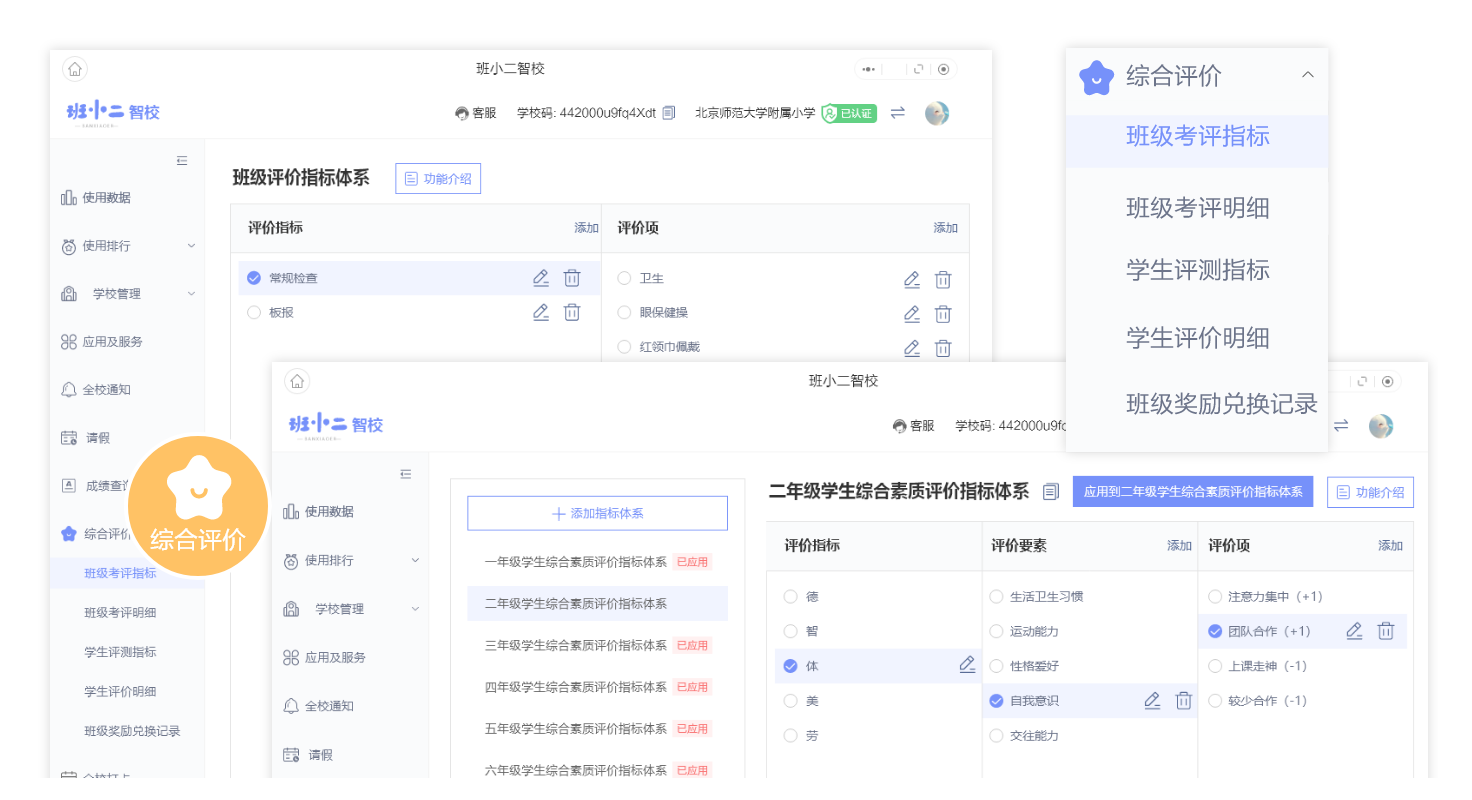 集家校沟通、德育管理、考勤管理、校园宣传全场景服务。覆盖全校通知、全校收集、全校打卡、全校成绩、校园食谱、班级管理、数据看板、综合评价、智能评语、