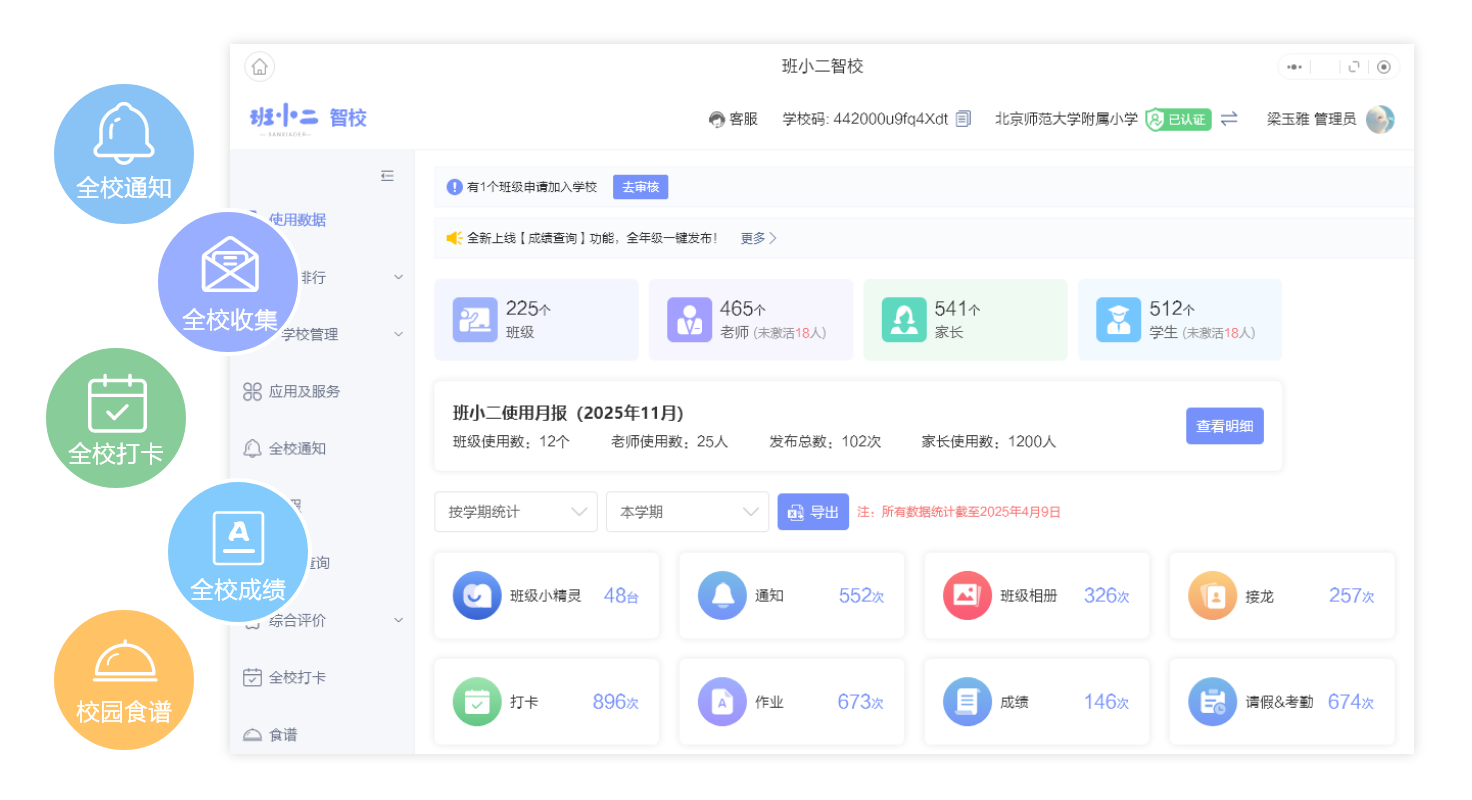 整合全校通知、全校打卡、全校成绩、校园食谱、全校信息收集核心功能,高效实现全校信息发布与收集反馈