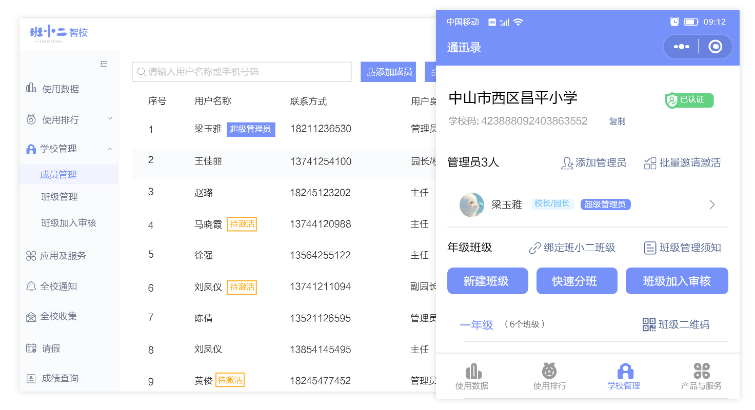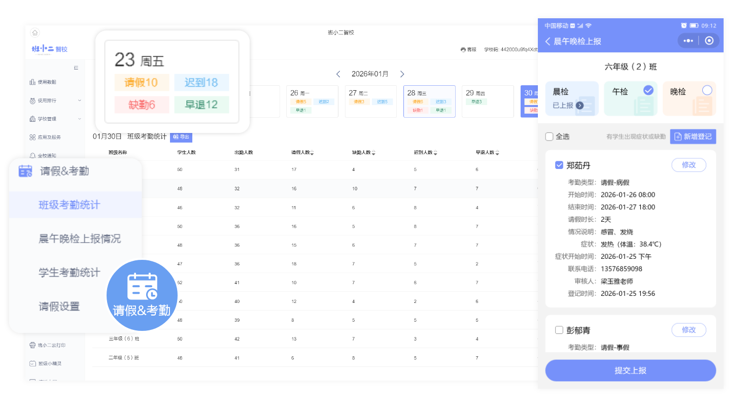请假考勤、微官网等多元应用;助力学校领导/管理员更轻松快捷的完成全校信息统一发布,精细化班级管理,数据看板实时统计使用情况。